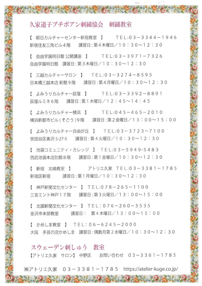 久家道子プチポアン刺繡協会 | 刺繍教室 プチポアン スエーデン刺繍 | 刺繍教室詳細 |